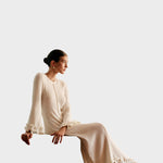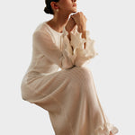 Ova prekrasna haljina kombinira sofisticirani dizajn s iznimnom udobnošću - nježne volančiće i luksuznu tkaninu koja se meko i fluidno spušta.
