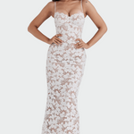 Elegantna maxi haljina od čipke s cvjetnim uzorkom koja ističe ženstvenost s elegancijom i bezvremenskim stilom. Tanke naramenice i prilagođeni kroj skladno obavijaju siluetu, čineći je idealnom za večernje izlaske ili posebne prilike. Prozirna tekstura čipke pruža osjećaj luksuza i romantike.