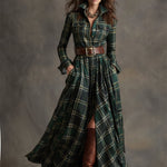 Ova maxi haljina nadahnuta vintage i etno stilom ima rever dizajn i karo uzorak u crvenkastom-smeđoj boji, besprijekorno spajajući retro šarm s toplim etno detaljima za bezvremenski i upečatljiv izgled. Uski kroj pojačava eleganciju, dok bogati karo uzorak dodaje slojevitu, nostalgičnu notu.