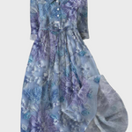 Ova duga haljina u nijansama lavande i plave kombinira romantiku i eleganciju. Njegov poseban cvjetni uzorak s cvijećem dodaje dašak svježine, dok ga lagana silueta čini idealnim za proljetne i ljetne prigode.