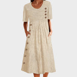 Ova haljina od visokokvalitetnog pamuka donosi savršen spoj elegancije i udobnosti. Sa ženstvenim krojem, praktičnim džepovima i detaljima s gumbima, lako se uklapa u dnevne i večernje prilike. Idealna je za one koje žele izgledati dotjerano, a osjećati se opušteno.