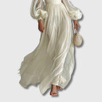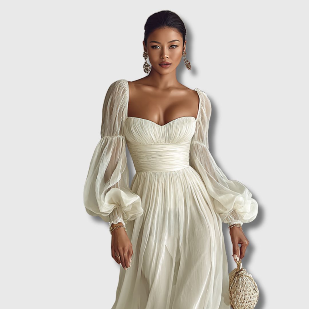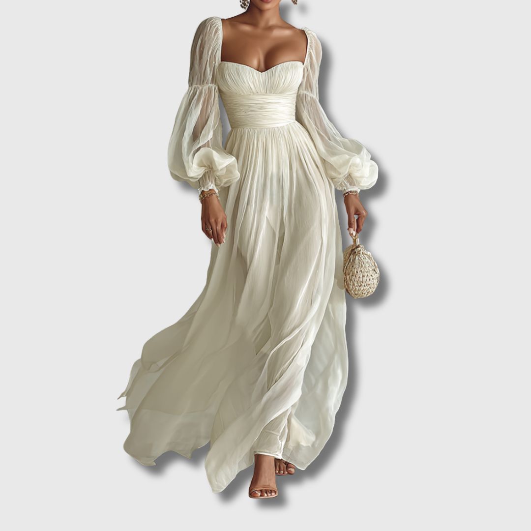 Ova maxi haljina od laganog šifona posebno je dizajnirana za žene koje cijene sofisticiran izgled i osjećaj lakoće. Kvadratni izrez i duge rukave krasi klasičan, a istovremeno moderan stil koji laskavo oblikuje figuru. Idealna je za večernje prilike, svečanosti ili elegantne dnevne kombinacije.