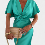 Haljina Nada u jednobojnoj nijansi nudi idealnu ravnotežu između opuštenog stila i elegantnog dizajna. S omotanim V izrezom, prednjim križnim čvorom i kratkim rukavima, ova uska silueta fluidno ističe figuru. Idealna je za neformalne planove kao i za posebne prigode.