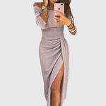 Nježna, blago sjajna silueta spuštenih ramena koja spaja profinjenost i suptilnu ženstvenost, dizajnirana da pada graciozno bez prijanjanja. Midi duljina stvara elegantnu, izduženu liniju, dok suknja inspirirana preklopom pruža pokret koji je istovremeno sofisticiran i nenametljivo ležeran.