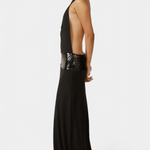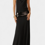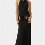 S suptilnim sjajem i očaravajućom siluetom, haljina Ana stvorena je da se istakne na svakom elegantnom događaju. Njezin drapirani halter izrez i potpuno otkrivena leđa nude savršen balans između sofisticiranosti i senzualnosti, dok traka od šljokica dodaje dašak rafiniranog luksuza.