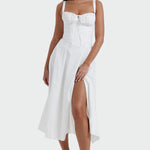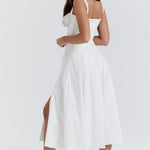 Ljetna haljina s bustierom koja kombinira ženstvenost i udobnost. Prilagođeni kroj u gornjem dijelu naglašava dekolte, dok lepršava suknja pruža pokret i svježinu. Idealna za ljetne šetnje, odmore i elegantne svakodnevne izlaske.