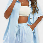 Košulja s džepom i podesivim vezanjem pruža ležeran šarm, dok visoki šorts osigurava udobnost i slobodu kretanja.