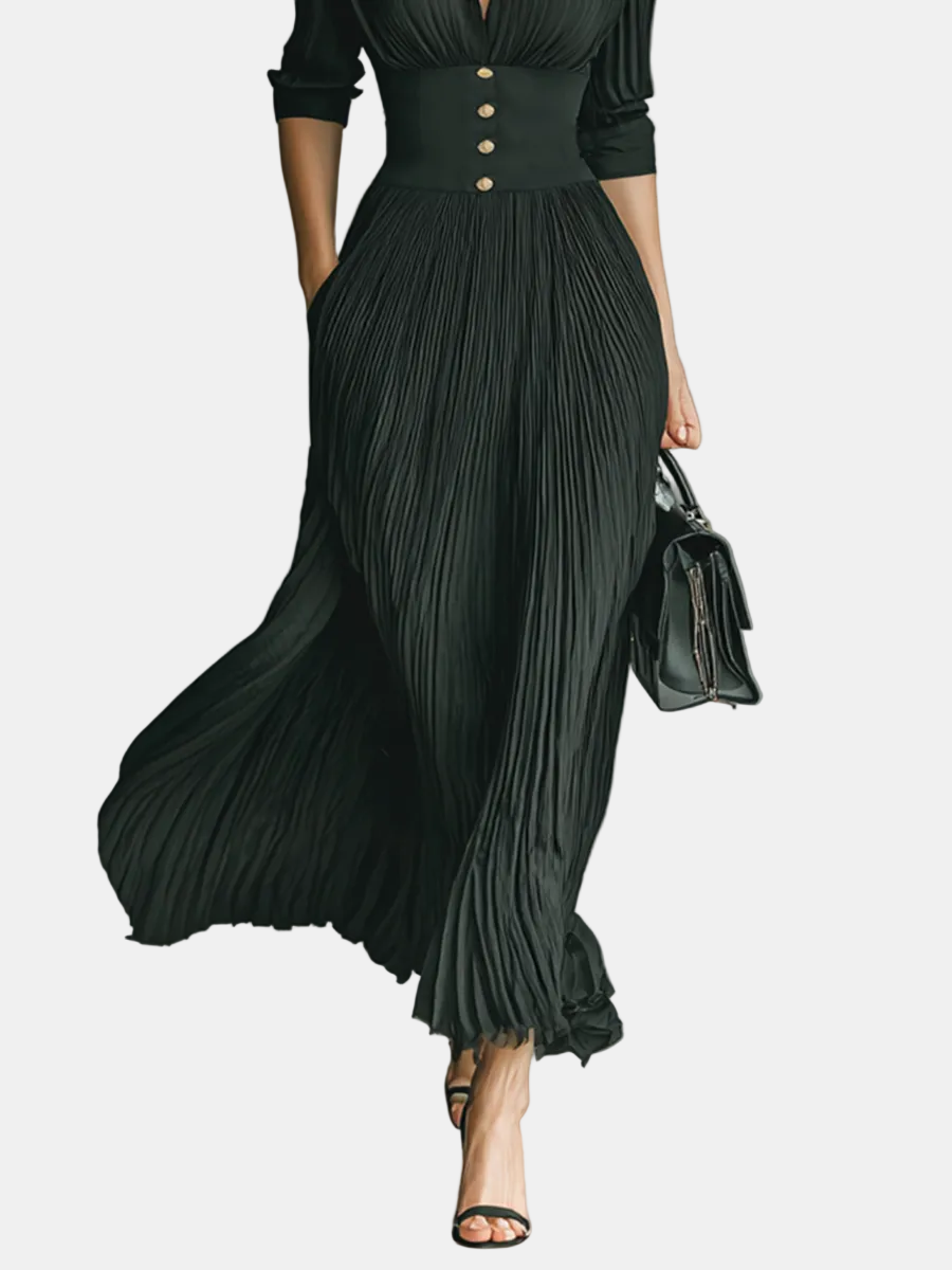Bezvremenska maxi haljina s besprijekornom krojačkom izradom, mekim naborima i oblikovanom strukom koja bez napora spaja klasičan šarm s modernom elegancijom.