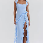 Razigrana i elegantna haljina s finim detaljima koji ističu ženstvenost. Prilagođeni korzet u kombinaciji s volanima i prorezom pruža pokret i jedinstveni karakter. Idealna za večernje izlaze i posebne prigode.