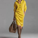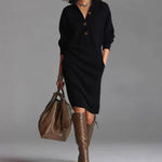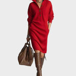 Ova fino pletena haljina odlikuje se plišanom teksturiranom tkaninom koja je jednako ugodna kao i izgleda. Dizajnirana za udobnost bez kompromisa u eleganciji, može se pohvaliti blago opuštenom siluetom koja prekrasno pristaje svakom tipu tijela. Dugi rukavi i dizajn do koljena čine je idealnom za hladnija godišnja doba, dok suptilni dekolte dodaje dašak profinjenosti. Bilo da je kombinirate s čizmama ili štiklama, ova haljina se besprijekorno prilagođava od ležernih spojeva uz kavu do formalnijih večeri.