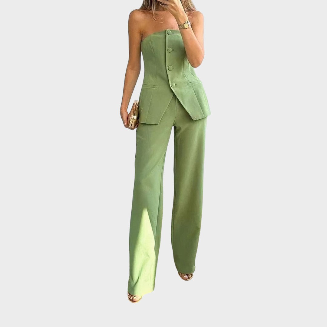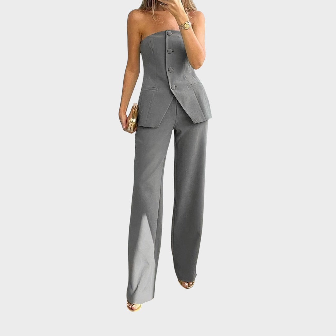 Ovaj elegantni set, sastavljen od strapless topa i ravno krojenih hlača, savršena je kombinacija stila i udobnosti. Top s modernim rezom naglašava siluetu, dok hlače visokog struka produžuju figuru i daju sofisticiran izgled. Idealan izbor za modne kombinacije koje spajaju ženstvenost i profinjenost, bilo da je riječ o večernjem izlasku, koktel zabavi ili posebnom događaju.