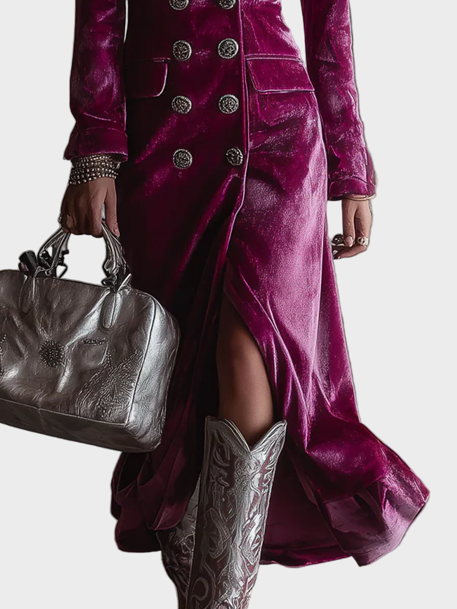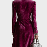 Ova duga, pripijena haljina-sako od vrhunskog baršuna zrači elegancijom i ženstvenim samopouzdanjem. Detalji s gumbima inspirirani vintage stilom i elegantno lepršava silueta daju joj jedinstven karakter. Strukturirana ramena i duboki dekolte stvaraju sofisticiran, ali senzualan izgled - savršen za svaku posebnu prigodu.